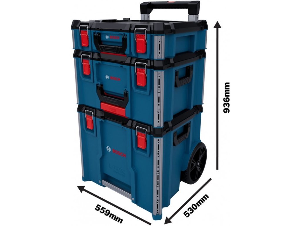 Mobilní modulární kufrový systém Bosch L-BOXX Contractor Set 3 Professional je ideálním řešením pro organizaci a přepravu nářadí na stavbách. Sada obsahuje tři propojitelné boxy L-BOXX Contractor 476, 322 a 170 s maximální nosností 198 kg. Robustní tělo z polypropylenu s krytím IP65 a kovovým zesílením rohů chrání nářadí i v nejnáročnějších podmínkách. Velká terénní kola o průměru 241 mm a plně výsuvná teleskopická rukojeť usnadňují přepravu na jakémkoli povrchu. Plná kompatibilita s L-BOXX systémem a ProClick portfoliem umožňuje neomezené rozšiřování a přizpůsobení.