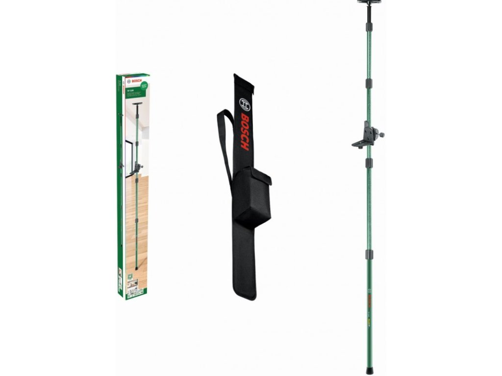 Bosch TP 320 teleskopická rozpěrná tyč (0603693101) je praktické řešení pro snadné a přesné polohování nivelačních přístrojů v rozsahu 0,1–3,20 m. Čtyři teleskopické díly s aretací otáčením umožňují rychlé sestavení a pevné nastavení výšky. Pružinová stropní deska zajišťuje stabilní upevnění v různých úhlech. Kompaktní rozměry po složení usnadňují přepravu i skladování. Tyč je kompatibilní se všemi nivelačními přístroji se závitem 1/4".