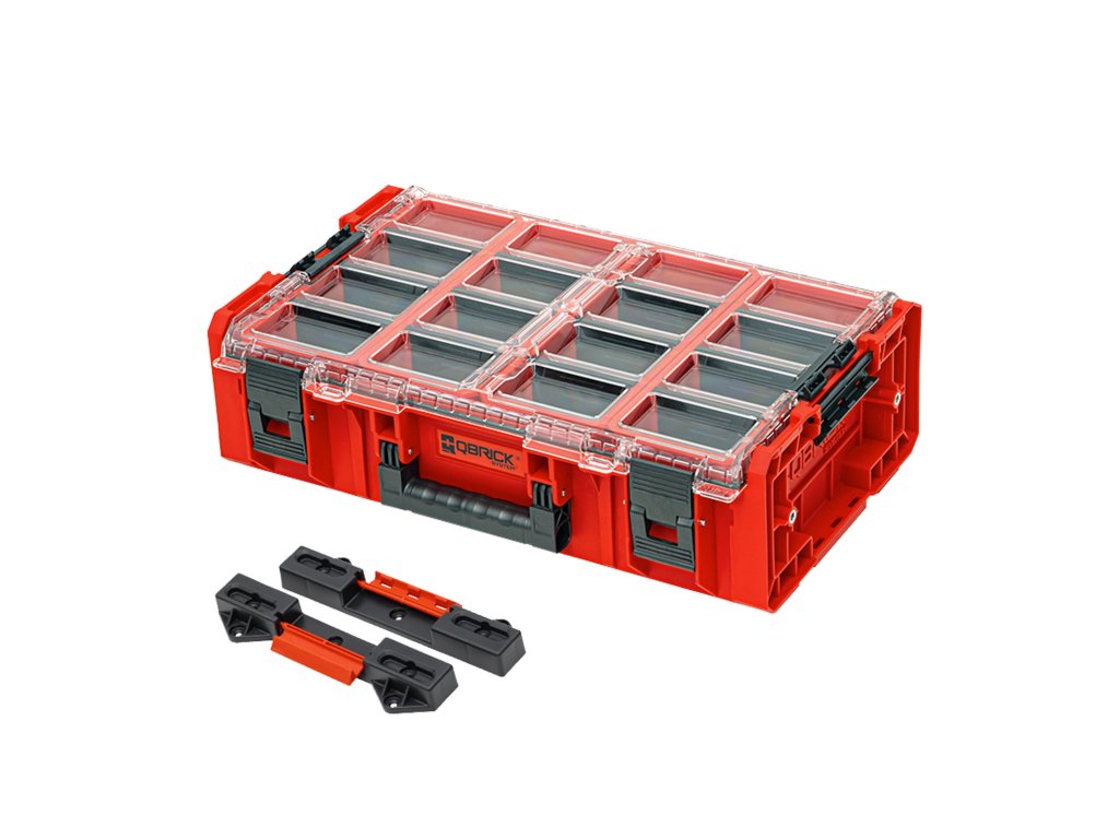 Organizér nářadí Je vyroben z extrémně odolného plastu RED ULTRA HD, který zvládá mechanické namáhání i mrazy. Čtyři kontejnery s nastavitelnými přepážkami umožňují přehledné a flexibilní uložení nářadí. Průhledné polykarbonátové víko zajišťuje okamžitý přehled o obsahu. Součástí balení jsou Connect adaptéry pro bezpečné propojení s dalšími boxy Qbrick ONE – a to jak horizontálně, tak vertikálně. Ideální řešení pro efektivní organizaci a přepravu nářadí na dílně i v terénu.Doplňkové parametry